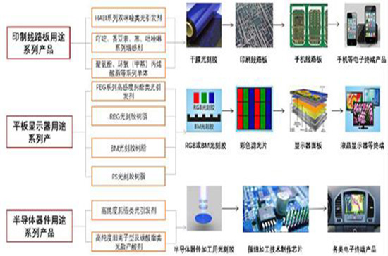 目前,公司有包括光刻膠用途在內的各類光引發劑產品近 30 個,包括自由基型光引發劑、陽離子型光引發劑、光增感劑、光產酸劑、光產堿劑等。強力的六芳基雙咪唑類系列光引發劑應用在印制線路板成像用感光性干膜領域,占世界市場份額的 60%,印制線路板成像用感光性干膜領域的世界大廠,如杜邦(美國)、日立化成(日本)、旭化成(日本)、長興(臺灣)、長春(臺灣)、科龍(韓國)等全都采用了強力的光引發劑。全世界 60%以上的手機、電腦、電視中的印制線路板上都用到強力的產品。強力的陽離子型光引發劑 PAG-201、 PAG-202 在 LED 封裝材料等應用領域也占有世界市場的 30%。強力擁有自主知識產權的新型高感度肟酯類光引發劑 PBG 產品系列,打破了BASF 公司同類產品在彩色濾光片制備領域的獨家壟斷,目前已被東京應化(日本)、三星(韓國)、LG(韓國)、友達(臺灣)、奇美(臺灣)等液晶顯示器面板大廠認證采用。