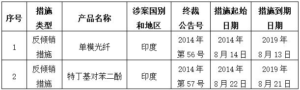 將于2019年7月1日至12月31日到期的反傾銷、反補貼措施一覽表