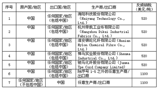 2020年10月29日,印度商工部發布公告稱,對原產于或進口自中國的尼龍簾子布(Nylon Tyre Cord Fabric)作出第三次反傾銷日落復審終裁,建議對中國涉案產品繼續征收反傾銷稅,詳細稅率見下表(附表:印度對華尼龍簾子布日落復審終裁征稅表),有效期為5年。本案涉及印度海關編碼5902. l0項下的產品。