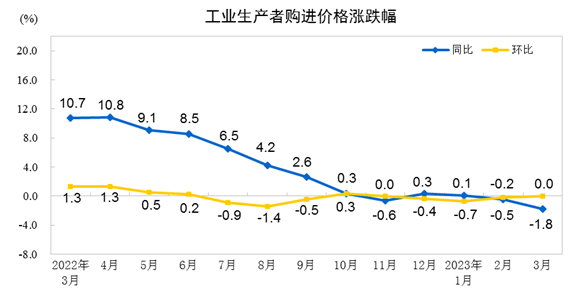 2023年3月份,全國工業生產者出廠價格同比下降2.5%,環比持平;工業生產者購進價格同比下降1.8%,環比持平。一季度,工業生產者出廠價格比去年同期下降1.6%,工業生產者購進價格下降0.8%。