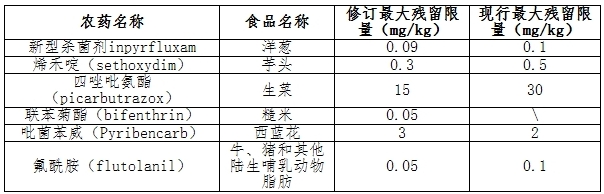 1.修制訂部分食品中新型殺菌劑inpyrfluxam等多種農獸藥的最大殘留限量,具體見下表;