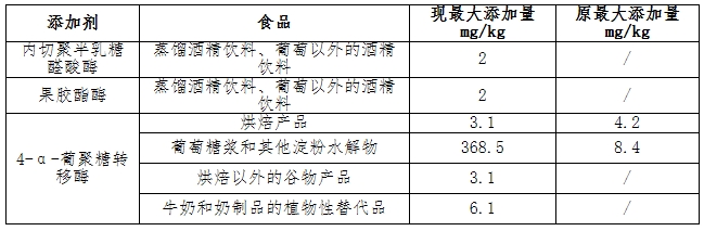 2024年4月5日,歐洲食品安全局(EFSA)發(fā)布2024.8701、2024.8700、2024.8698號(hào)文件,擬制訂內(nèi)切聚半乳糖醛酸酶、果膠酯酶、4-α-葡聚糖轉(zhuǎn)移酶作為食品添加劑的使用規(guī)定,具體使用要求如下表。該文件將于歐盟官方公報(bào)正式發(fā)布之日起生效。