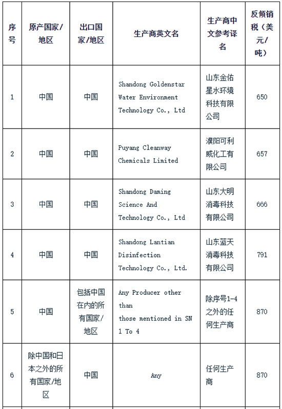 印度對涉華三氯異氰尿酸初裁建議征稅表
