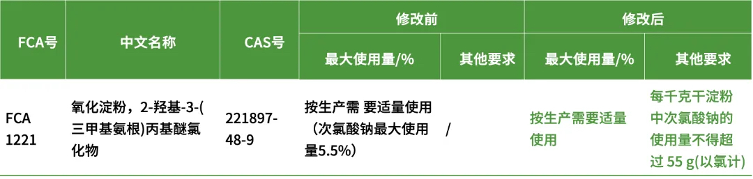 通過對原始申報資料的核實以及結(jié)合國外法規(guī)批準(zhǔn)情況,對表A.6食品接觸用紙和紙板材料及制品中允許使用的添加劑“氧化淀粉,2-羥基-3-(三甲基氨根)丙基醚氯化物”的用量和要求進(jìn)行修訂。