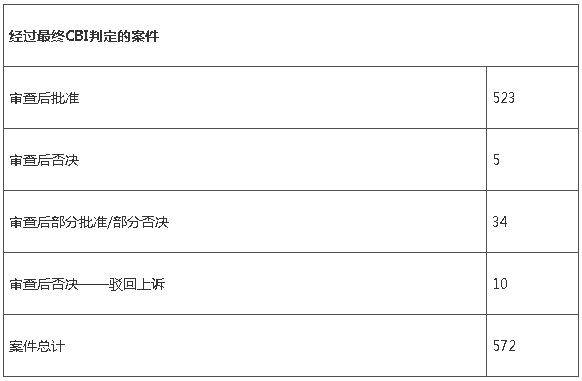 同期EPA發布了2016年6月22日至2019年6月25日收到的CBI審查的統計數據。2016年頒布的TSCA改革法案中,對CBI相關規定也進行了修訂。此后,EPA建立了許多新的流程、系統和規程,使提交人能夠在提出保密聲明時提供所需的信息,促進EPA對這些聲明的審查并在適用的情況下做出判定。以下為EPA公布的近三年間CBI案件審查情況。