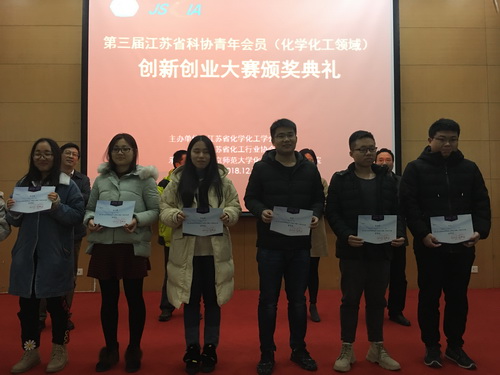 2018年12月7日,由江蘇省化學化工學會等單位主辦的第三屆江蘇省科協青年會員(化學化工領域)創新創業大賽頒獎典禮在南京師范大學敬文圖書館學術報告廳舉行。本次大賽自6月份啟動以來,共收到27件作品,經評審專家委員會評審、組織委員會審定,共評出一等獎7件,二等獎10件,三等獎10件。省科協人才服務中心副主任焦惠娟、省化學化工學會副秘書長馬建平、南京師范大學化學與材料科學學院黨委書記宋清濤、院長包建春、副院長張守林等分別向一、二、三等獎獲獎者頒發了證書。