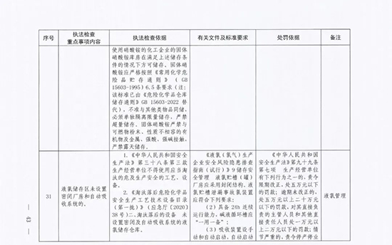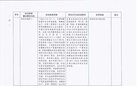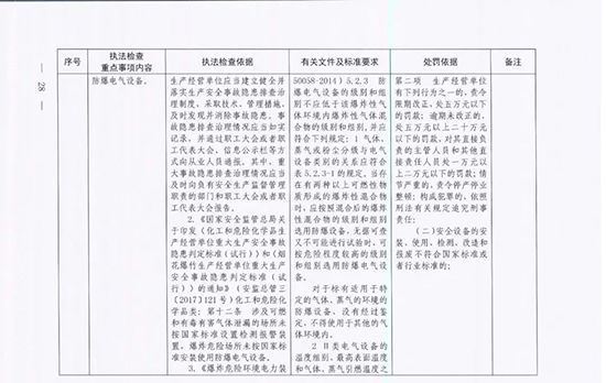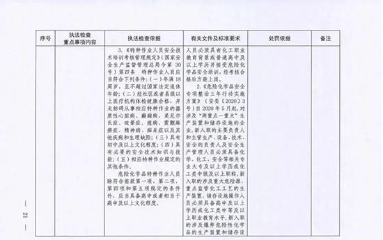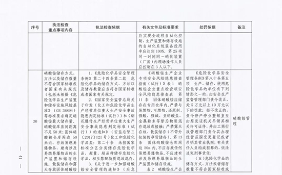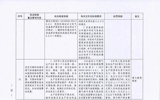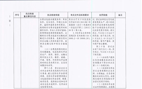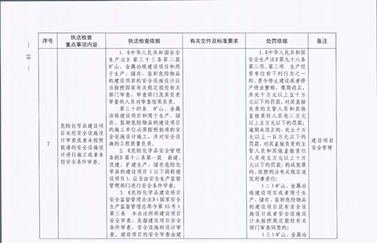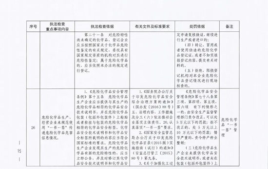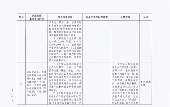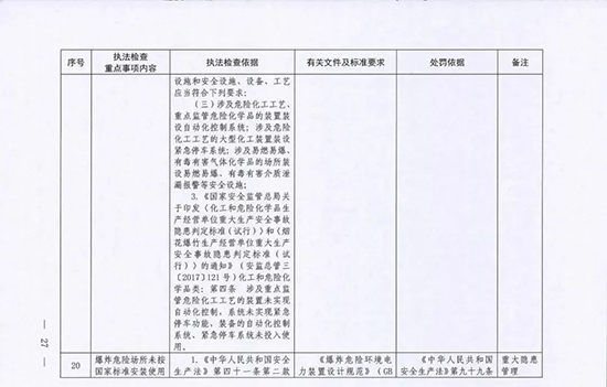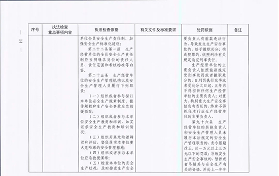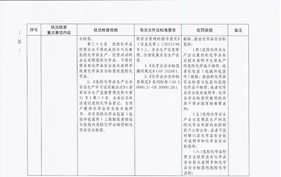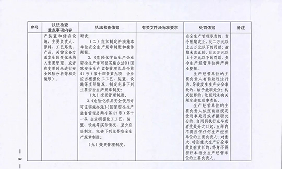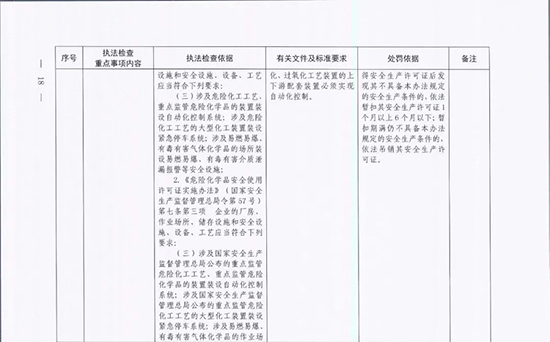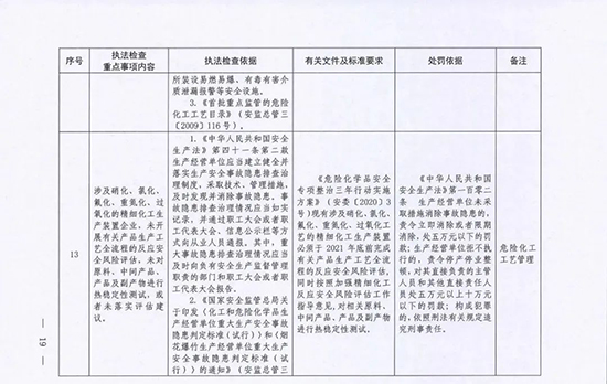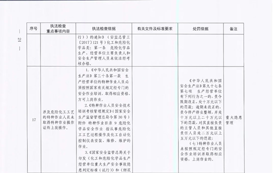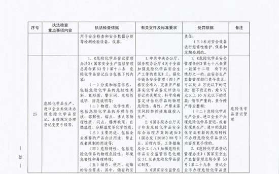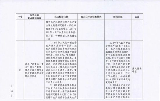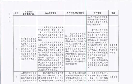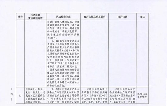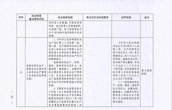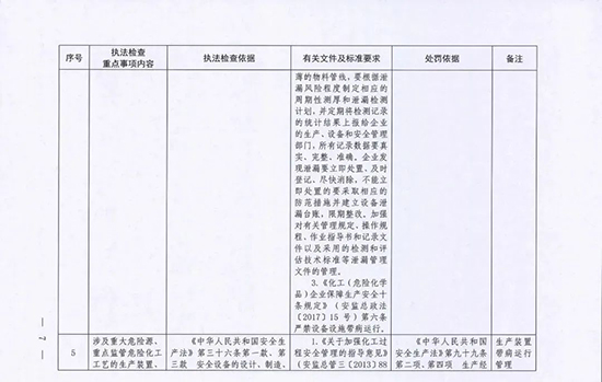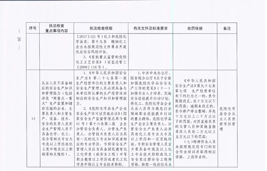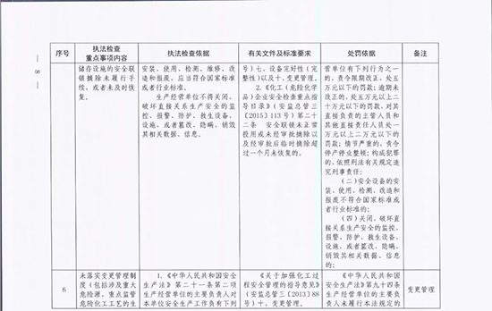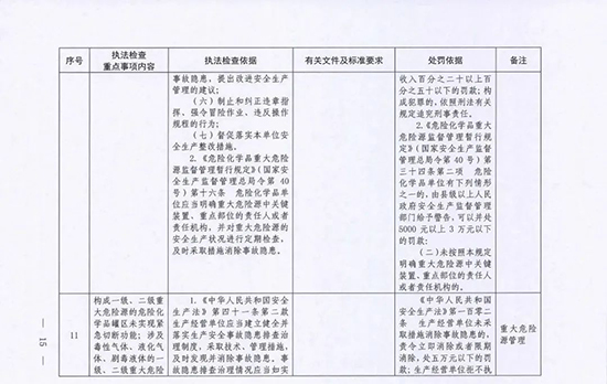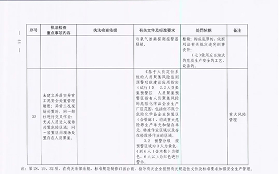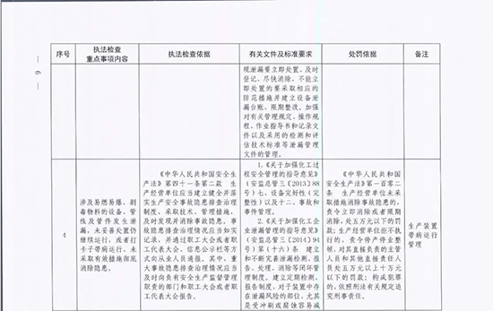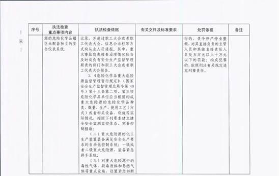 《指導目錄》圍繞重大安全風險防控和重大安全隱患排查治理,聚焦關鍵人(企業主要負責人)、關鍵企業(涉及重點監管危險化工工藝、重點監管危險化學品、重大危險源企業)和關鍵環節(特殊作業、雙重預防、報警聯鎖等),明確了32項重點執法檢查內容,包括危險化學品安全執法檢查重點事項內容、執法檢查依據、有關規范性文件和標準要求以及處罰依據,內容明晰,具有很強的指導性。
